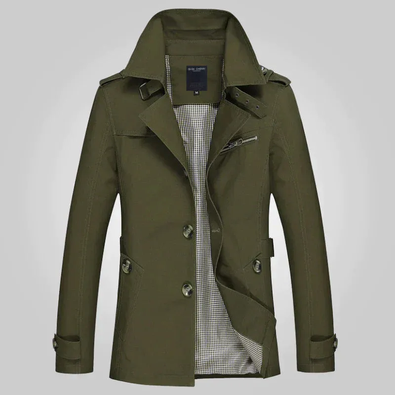 - Stijl: Klassieke trenchcoat met dubbele knoopsluiting en riem