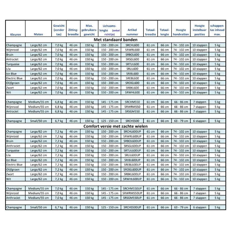 Zithoogtes: Large/62 cm, Medium/55 cm, Small/50 cm.