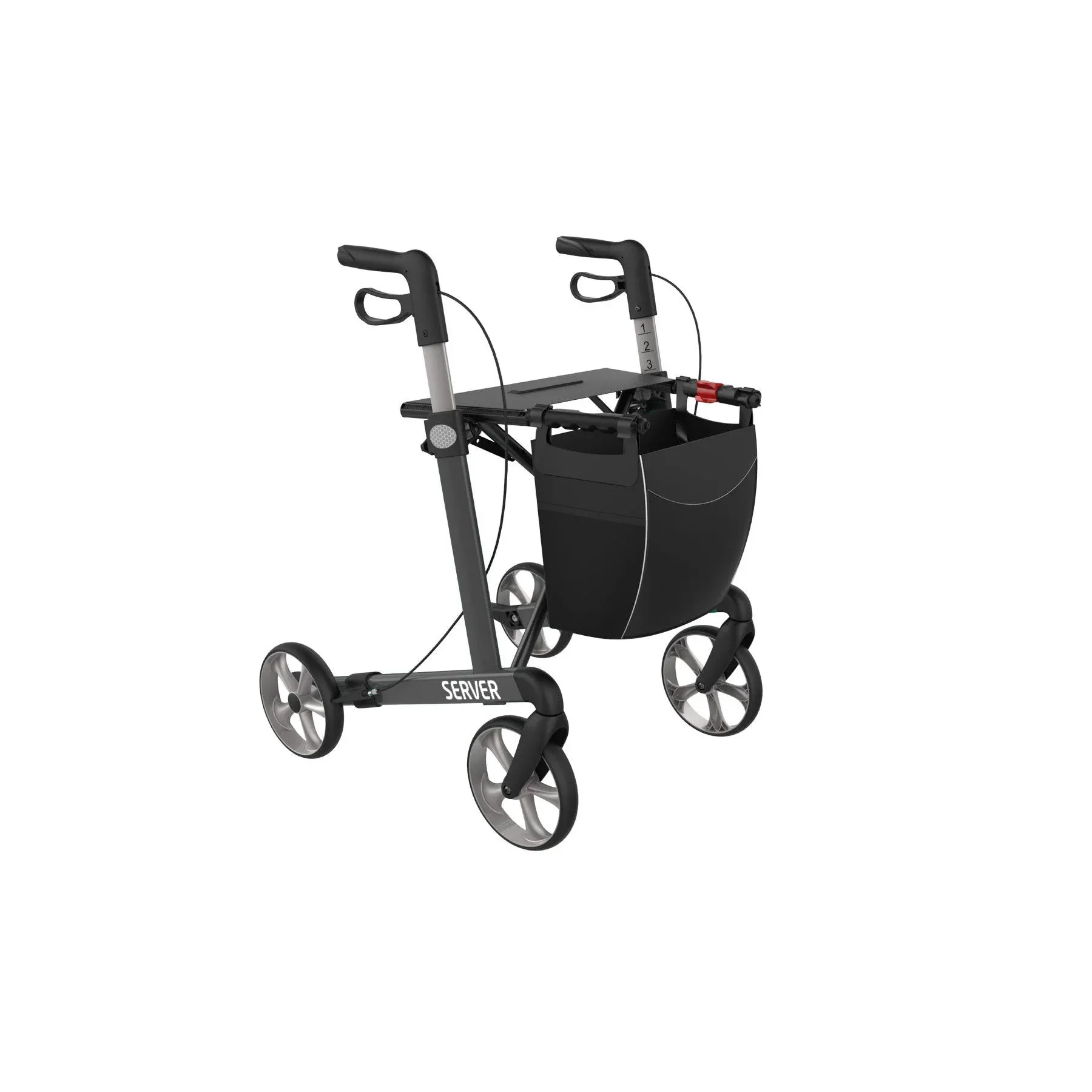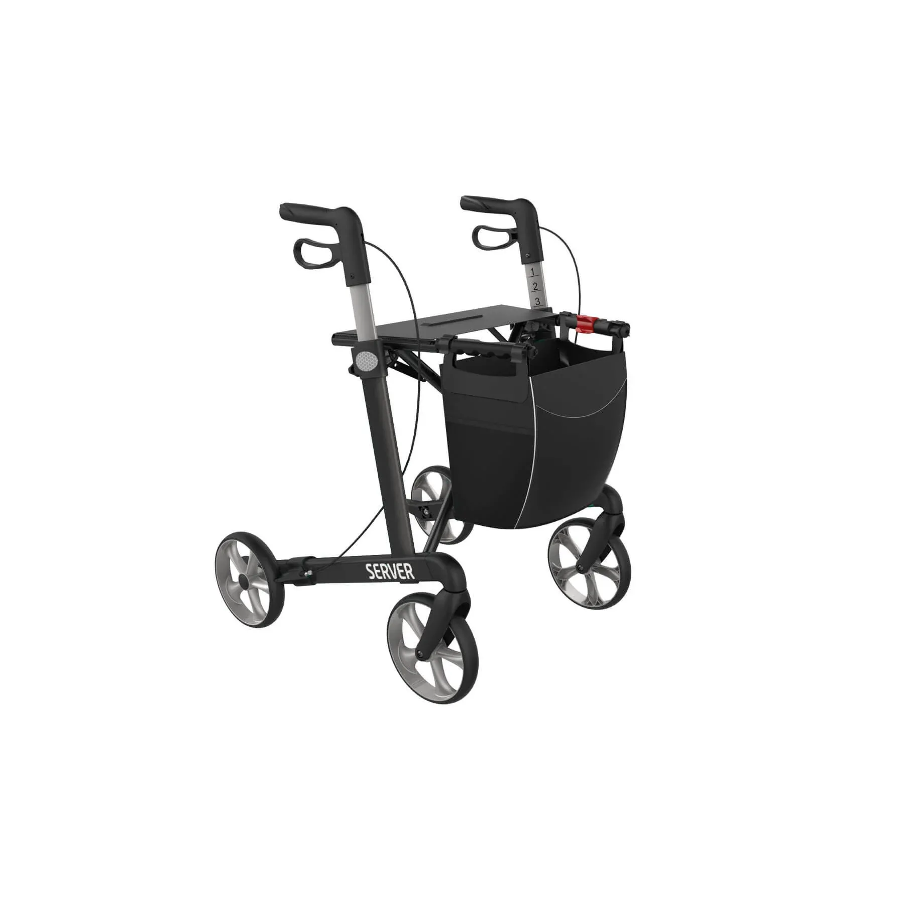 De stijlvolle Server rollator heeft een uniek driehoekig profiel en een vast gelast frame. Het is met een eigen gewicht van ruim onder de 7,5 kg een van de lichtste rollators op de markt in de categorie gebruikers tot een maximaal gewicht van 150 kg.