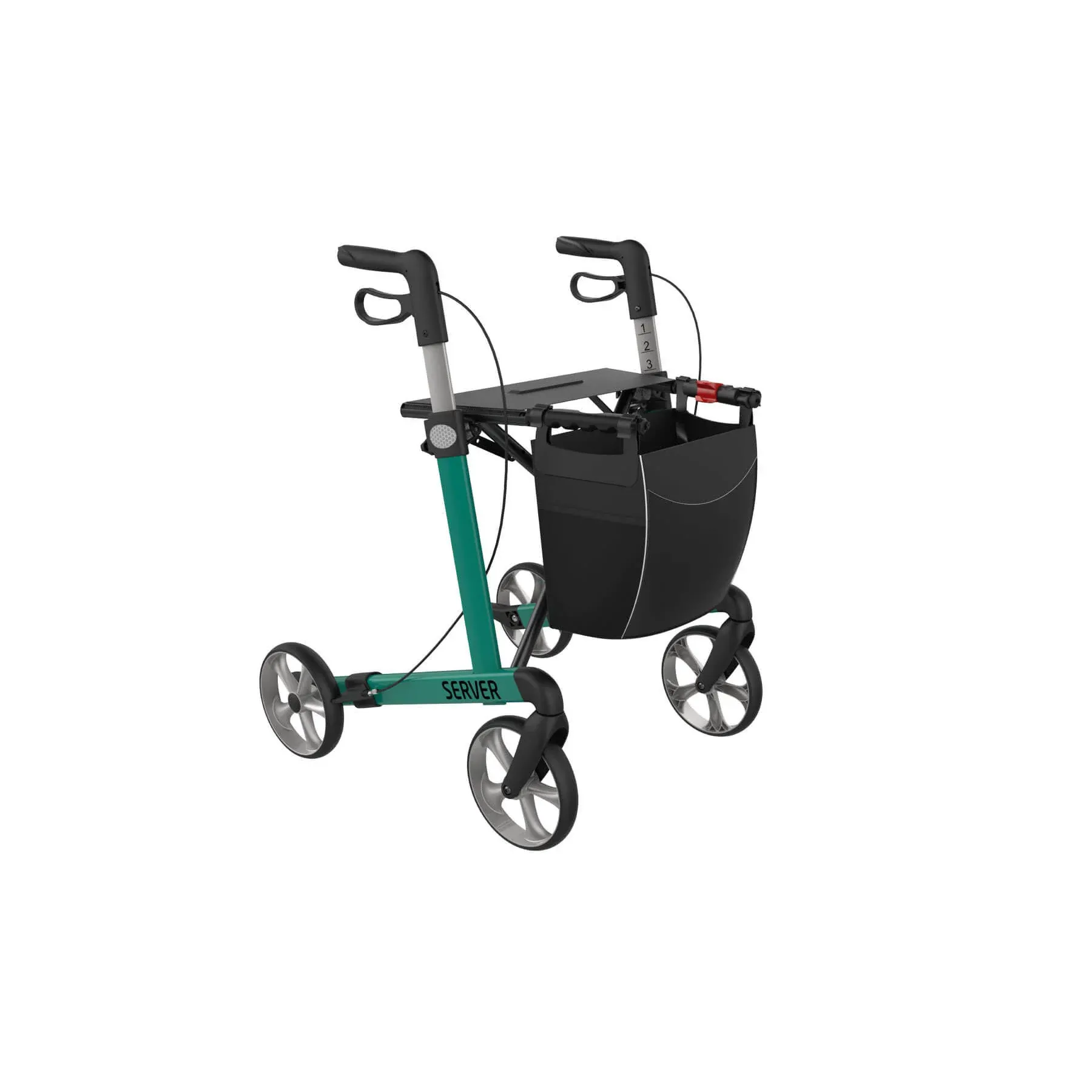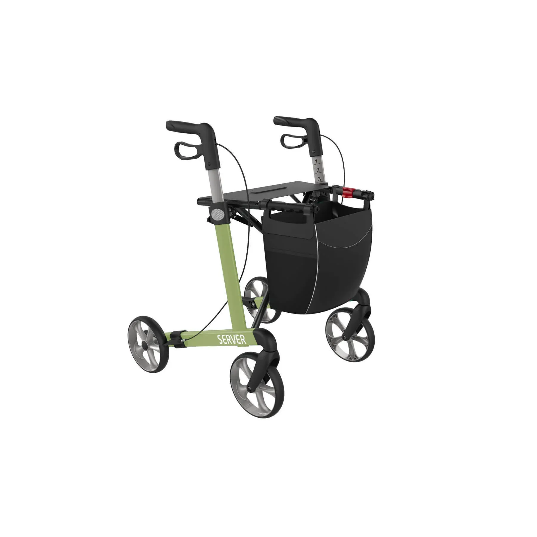 De Server is eenvoudig in te klappen en blijft gesloten door het eenvoudige vergrendelingssysteem welke tevens dient als ergonomisch gevormd handvat waarmee de rollator opgepakt kan worden.