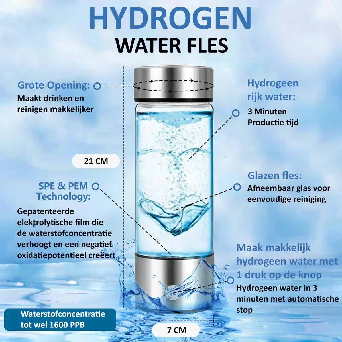- Eenvoudig in gebruik: vul de fles met water en geniet van de voordelen van waterstofrijk water binnen enkele minuten.